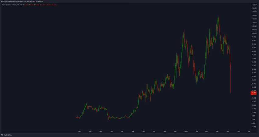 El trader de criptomonedas @blurcrypto tuiteó un gráfico que muestra que el precio ha caído en más del 50% en un solo día.
