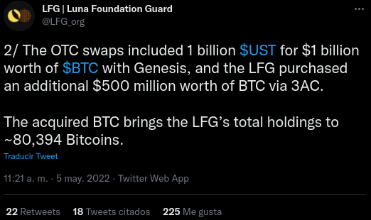 En este sentido, la LFG cerró con el bróker Génesis un swap OTC de 1 mil millones de dólares de UST por su equivalente en BTC. Por otro lado, compró 500 millones de dólares en BTC del fondo de cobertura Three Arrows Capital.