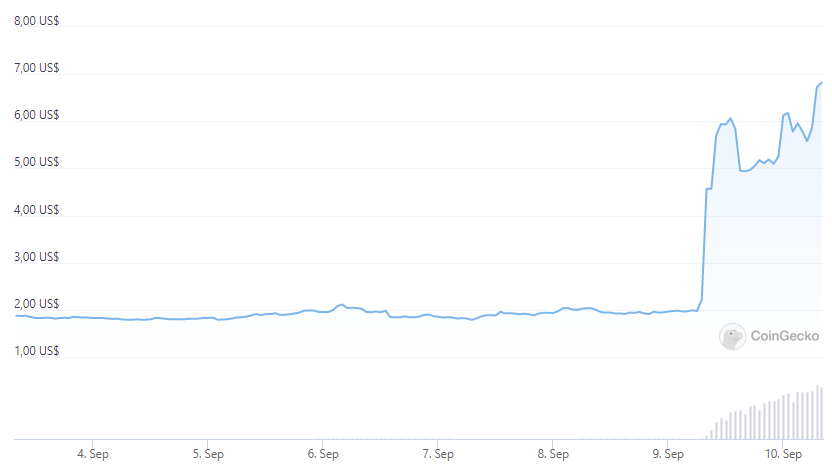 SponsoredEl pasado domingo 4 de septiembre, el token LUNA cotizaba en 1.79 dólares y se mantuvo en ese rango hasta el viernes 9 de septiembre, cuando inició su movimiento al alza.