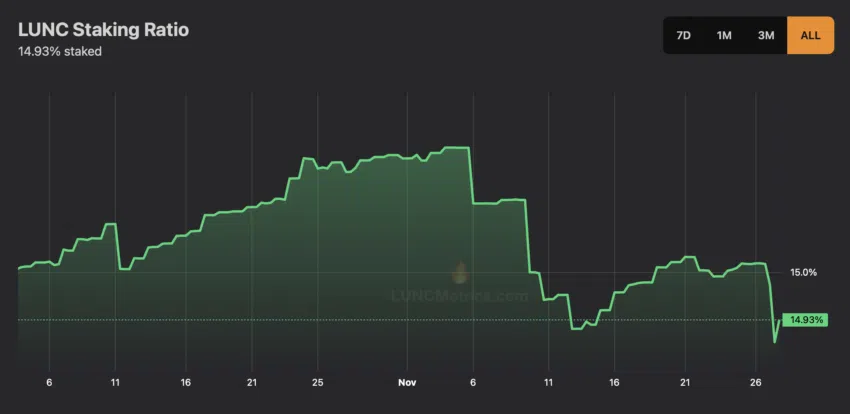 Al mismo tiempo, el número de fichas apostadas en la red Terra Classic también ha aumentado. La proporción de tokens LUNC apostados había aumentado hasta el 15% del suministro total el 24 de noviembre.