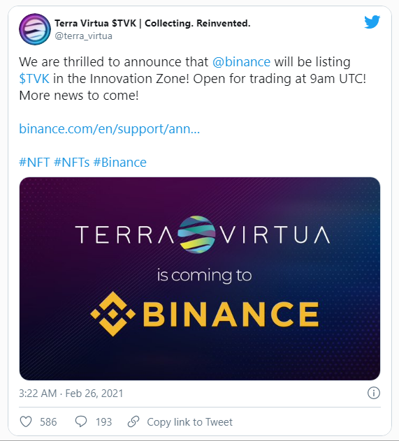 Según un anuncio del 26 de febrero por parte del exchange, la autoproclamada primera plataforma coleccionable digital inmersiva, Terra Virtua Kolect, se ha agregado a la Zona de Innovación de Binance. Comenzó a cotizar exactamente a las 9:00 a.m. (UTC). Actualmente hay dos pares (TVK/BTC y TVK/BUSD) disponibles para negociar.