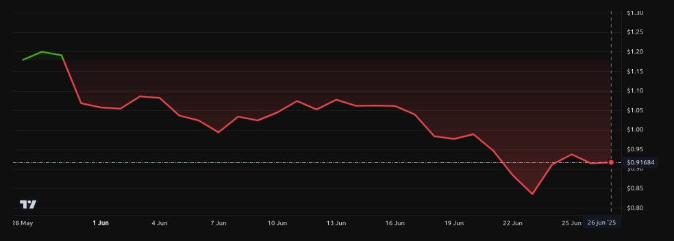A pesar de los resultados positivos del club, el fan token JUV ha experimentado un rendimiento opuesto, desplomándose más del 22% en los últimos 30 días. Al momento de la publicación, JUV cotiza en 0.916 dólares tras caer 3.35% en las últimas 24 horas, según datos de BeInCrypto.