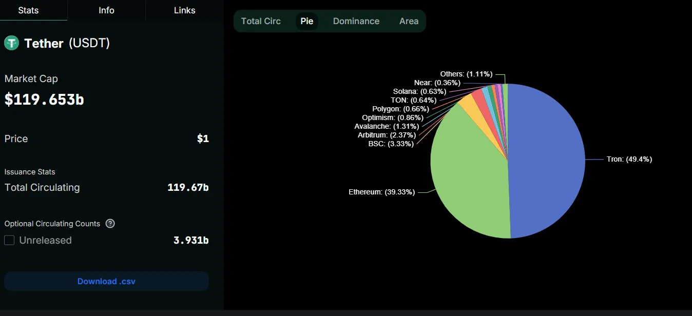 A lo largo de la última década, USDT ha crecido hasta convertirse en la tercera criptomoneda más grande por capitalización de mercado, solo detrás de Bitcoin y Ethereum. Los datos de DeFillama muestran que el activo tiene una capitalización de mercado de casi 120 millones de dólares, controlando alrededor del 69% del mercado de stablecoins.