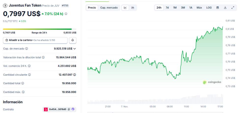 La noticia generó una reacción positiva en el fan token JUV del club italiano, el cual ha aumentado 7% en las últimas 24 horas para cotizar en 0.7997 dólares, según datos de CoinGecko.