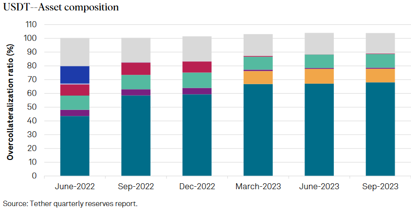 Las debilidades en la gestión de reservas podrían indicar la falta de regulación y la limitada capacidad de redención de USDT. La puntuación podría mejorar con más información y al cambiar hacia activos menos riesgosos. La institucionalidad es clave, ya que el respaldo de una entidad gubernamental o reguladora podría mejorar la calificación, y lo contrario también sería cierto.
