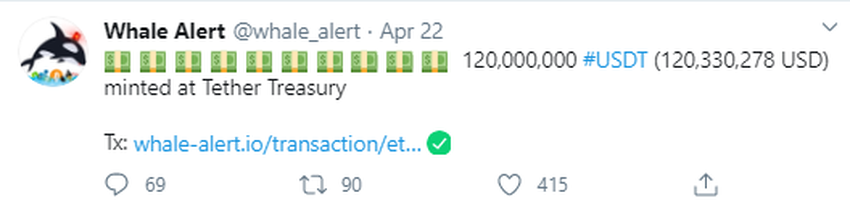 Ayer, la comunidad de la criptomonedas no se sorprendió al descubrir que Tether estaba acuñando otros 120 millones de dólares. La emisión fue recogida por Whale Alert (@whale_alert).