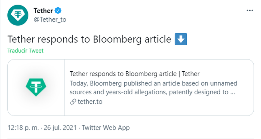 “Hoy, Bloomberg publicó un artículo basado en fuentes anónimas y acusaciones de hace años, evidentemente diseñado para generar clics. Este artículo sigue un patrón de re-empaquetar reclamos obsoletos como ‘noticias’. Los continuos esfuerzos para desacreditar a Tether no cambiarán nuestra determinación de seguir siendo líderes en la comunidad.