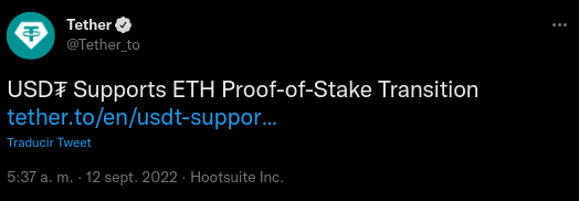 “Tether seguirá de cerca el progreso y los preparativos de este evento y apoyará a [la] POS [de] Ethereum de acuerdo con el cronograma oficial. Creemos que una transición fluida es esencial para la salud a largo plazo del ecosistema DeFi y sus plataformas, incluidas aquellas que usan nuestros tokens”.