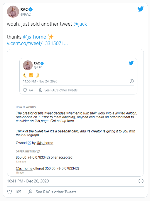 Como se vio anteriormente, el músico ganador del premio Grammy, RAC, explicó que acaba de vender un tweet a un fan por 50 dólares en ETH, algo que probablemente hubiera sido inimaginable hace solo un año.