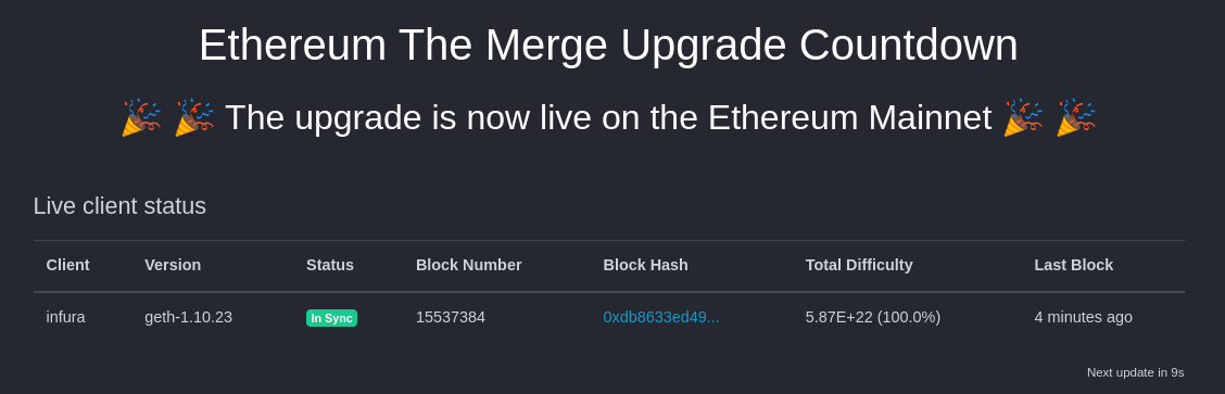 El hito fue alcanzado el 15 de septiembre a las 06:43 UTC. Así se pudo constatar a través del reloj de cuenta regresiva disponible en la página web de Ethernodes.