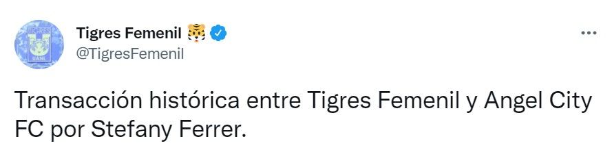 Sponsored“Hoy seguimos haciendo historia. Tigres Femenil confirma la transferencia de Stefany Ferrer al Angel City FC, convirtiéndose en el primer traspaso de una jugadora de la Liga MX Femenil a un equipo de la National Womens Soccer League (NWSL), y también es la primera ocasión en la que se utiliza una criptomoneda como método de pago”