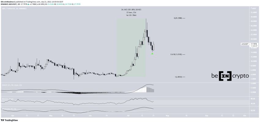 AXS ha estado aumentando a un ritmo rápido desde el 22 de Junio. En un lapso de 23 días, el token aumentó en un 921%. El movimiento alcista culminó con un precio máximo histórico de 29,20 dólares el 15 de Julio.