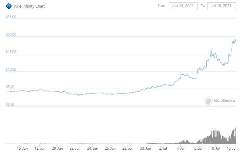 De acuerdo a los datos de CoinGecko, a primeras horas del sábado 10 de julio, AXS registró un nuevo ATH de 19,63 dólares, lo que representa un aumento diario del 55%.