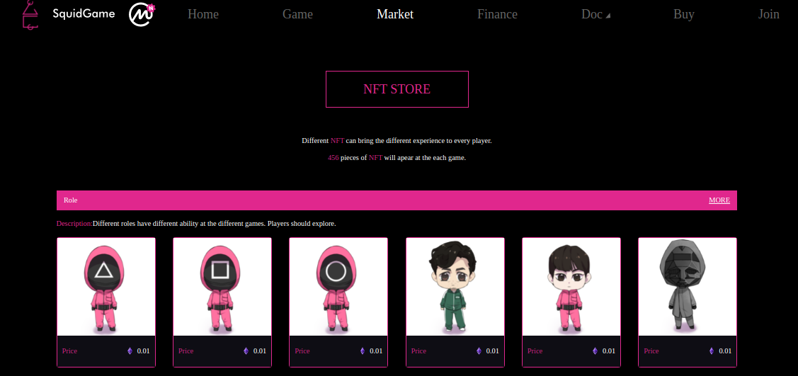 Además, debe comprar boletos de entrada en forma de NFT, que están disponibles en el sitio web. Algunos de ellos representan personajes de la serie. Incluyendo personas con ropa rosa y máscaras con el letrero apropiado que represente a su clase en el ecosistema de gestión de juegos.