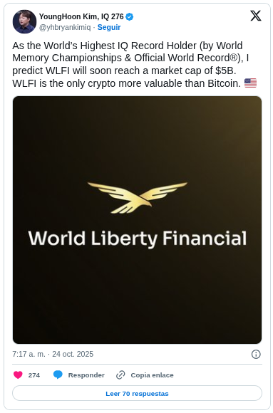 “Como poseedor del récord mundial de coeficiente intelectual más alto (según el World Memory Championships & Official World Record® ), predigo que WLFI pronto alcanzará una capitalización de mercado de $5 mil millones. WLFI es la única criptomoneda más valiosa que Bitcoin”, expuso YoungHoon Kim en X.