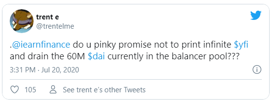 La semana pasada, los llamados “agricultores de rendimiento” estaban proporcionando liquidez a Curve.fi y registraban tasas de porcentaje anual del 500% – 1000%. Parte del regreso fue en YFI. Ahora, la capacidad de recibir YFI en Curve.fi en el futuro es incierta.
