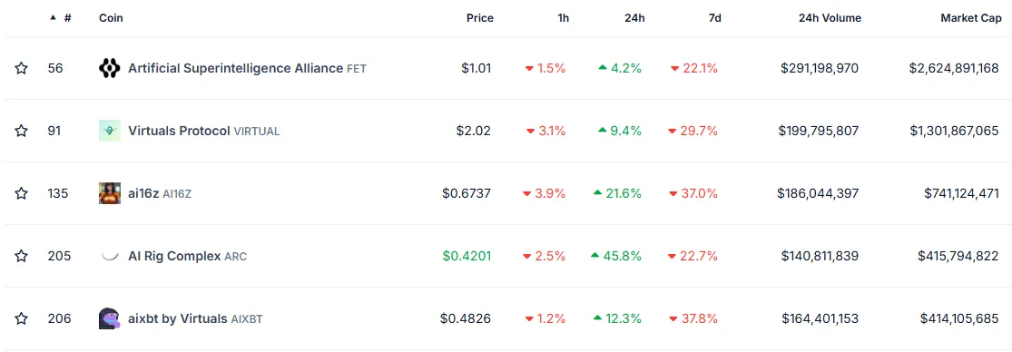 Tras estos desarrollos, las monedas de AI Agent, que habían enfrentado grandes pérdidas a principios de esta semana, comenzaron a recuperarse. Virtuals Protocol subió más del 8%, mientras que AIXBT y Ai16z ganaron más del 10% a medida que los inversores redirigieron su enfoque hacia proyectos de IA descentralizados.