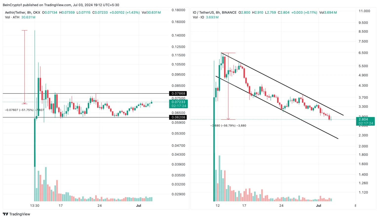 Aethir y io.net, cuyos tokens debutaron el 11 y 12 de junio respectivamente, inicialmente cautivaron al mercado con su visión de democratizar el acceso a la potencia informática de alto rendimiento. Específicamente, Aethir ha forjado asociaciones en los sectores de juegos y inteligencia artificial.