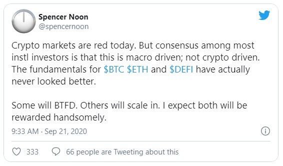 El director de DTC Capital, Spencer Noon [@spencernoon], señaló que el movimiento parece estar impulsado por las macros y los fundamentos de Bitcoin, Ethereum y DeFi siguen siendo sólidos: