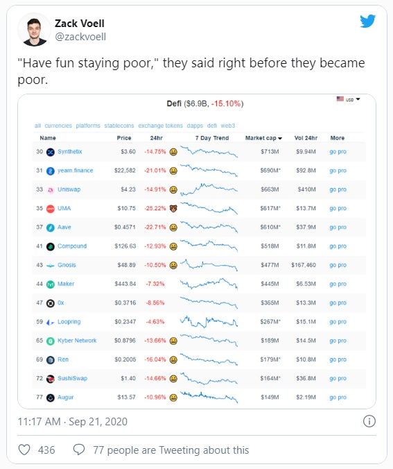 Esto parece haber sido del agrado de varios maximalistas de Bitcoin, incluido el miembro de la comunidad BTC, Zack Voell (@zackvoell), quien publicó una captura de pantalla del sangrado del mercado de DeFi: