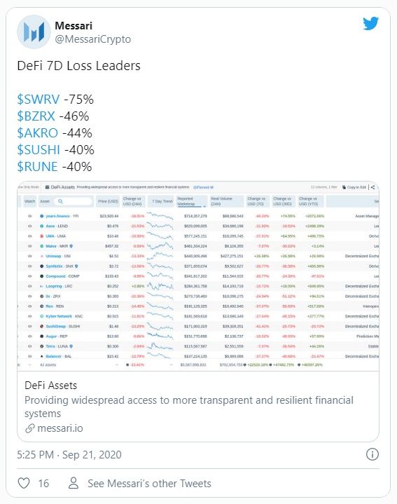 Muchos de los tokens DeFi principales, incluidos LEND, CRV, UNI, SUSHI, BAL, UMA, KAVA, REN, SNX, SWRV e YFI, han perdido dos dígitos en las últimas 24 horas: