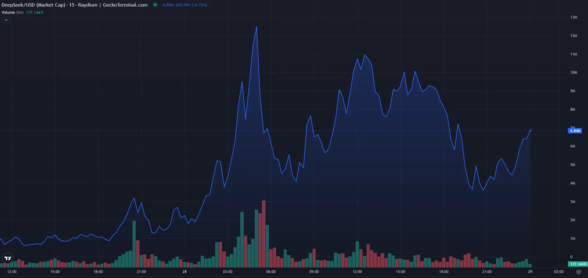 Seek, el primer token falso de DeepSeek, se lanzó. Logró acumular una capitalización de mercado de 48 millones de dólares antes de desplomarse. Este primer rug pull fue tan exitoso que los estafadores lanzaron otro. Una memecoin basada en Solana se negoció bajo el nombre “DeepSeek” y alcanzó una capitalización de mercado de más de 12 millones de dólares.