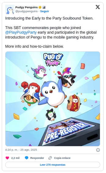 Pudgy Penguins lanzará el Soulbound Token “Early to the Party” como recompensa a quienes pre-descarguen Pudgy Party antes de su estreno el 29 de agosto. Este SBT es intransferible y reconoce la participación temprana, reforzando la estrategia Web3 de la marca y su apuesta por combinar gaming y blockchain.