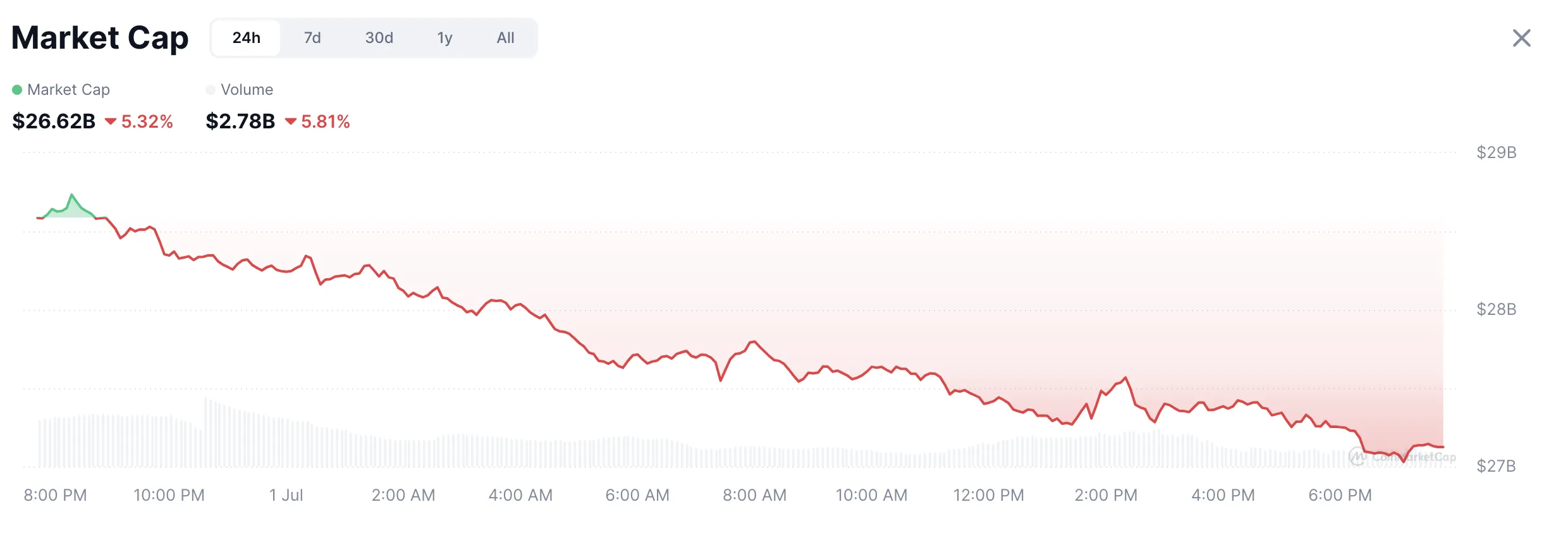 Este caos podría crear nuevas oportunidades, pero es incierto dónde aparecerán. Además, el sector de tokens de IA ya estaba en una caída antes de que se aprobara el proyecto de ley. Estas caídas del 5% son preocupantes, pero los volúmenes de comercio de activos de IA cayeron más del 38% en los últimos 30 días.