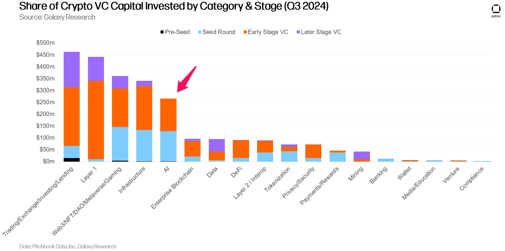 Una diferencia clave entre las monedas de IA y las memecoins es el nivel de interés de las firmas de capital de riesgo (VC). Según un informe reciente de Galaxy, los VC son escépticos sobre el valor a largo plazo de las memecoins, optando en cambio por sectores que creen que tienen un mayor potencial.