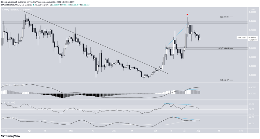 SAND ha estado aumentando desde el 22 de junio, cuando cotizaba a un mínimo de 0,146 dólares. Poco después, logró salir de una línea de resistencia descendente y aumentó a un ritmo acelerado.