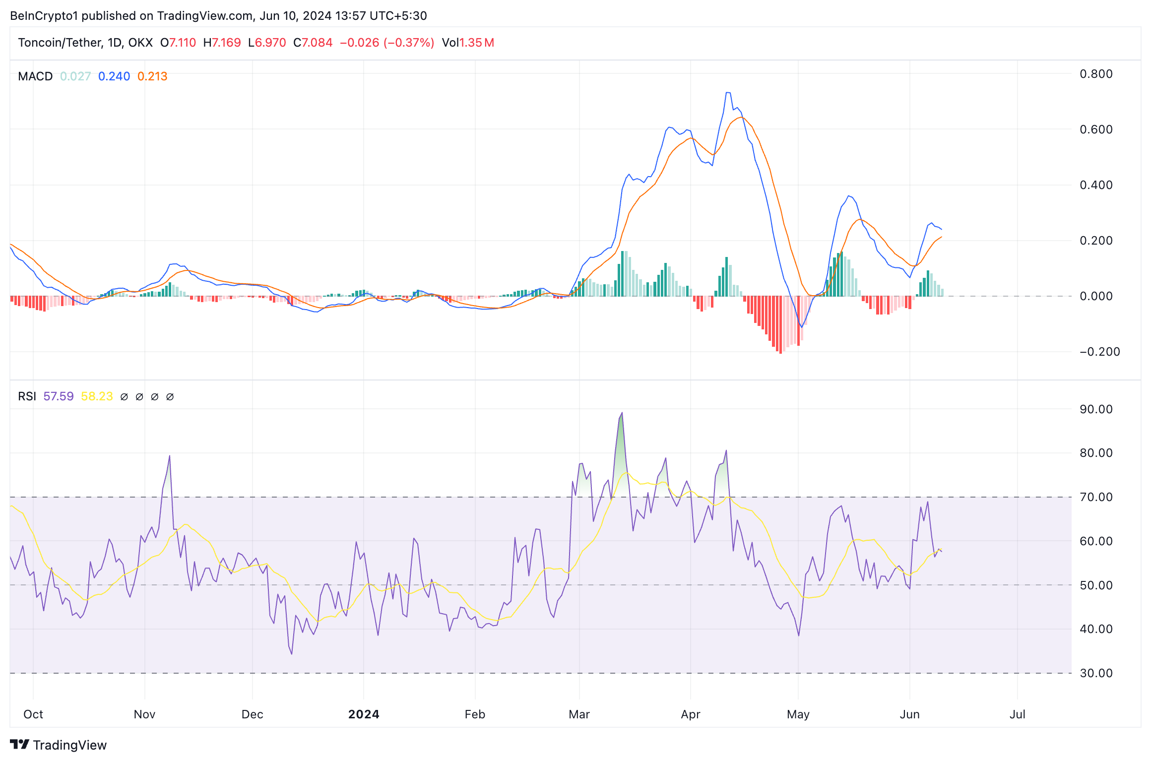 Las lecturas del indicador Convergencia/Divergencia de Medias Móviles (MACD) de la altcoin apuntan a esta posibilidad. Al cierre de esta edición, la línea MACD de TON (azul) está preparada para cruzar por debajo de su línea de señal (naranja).