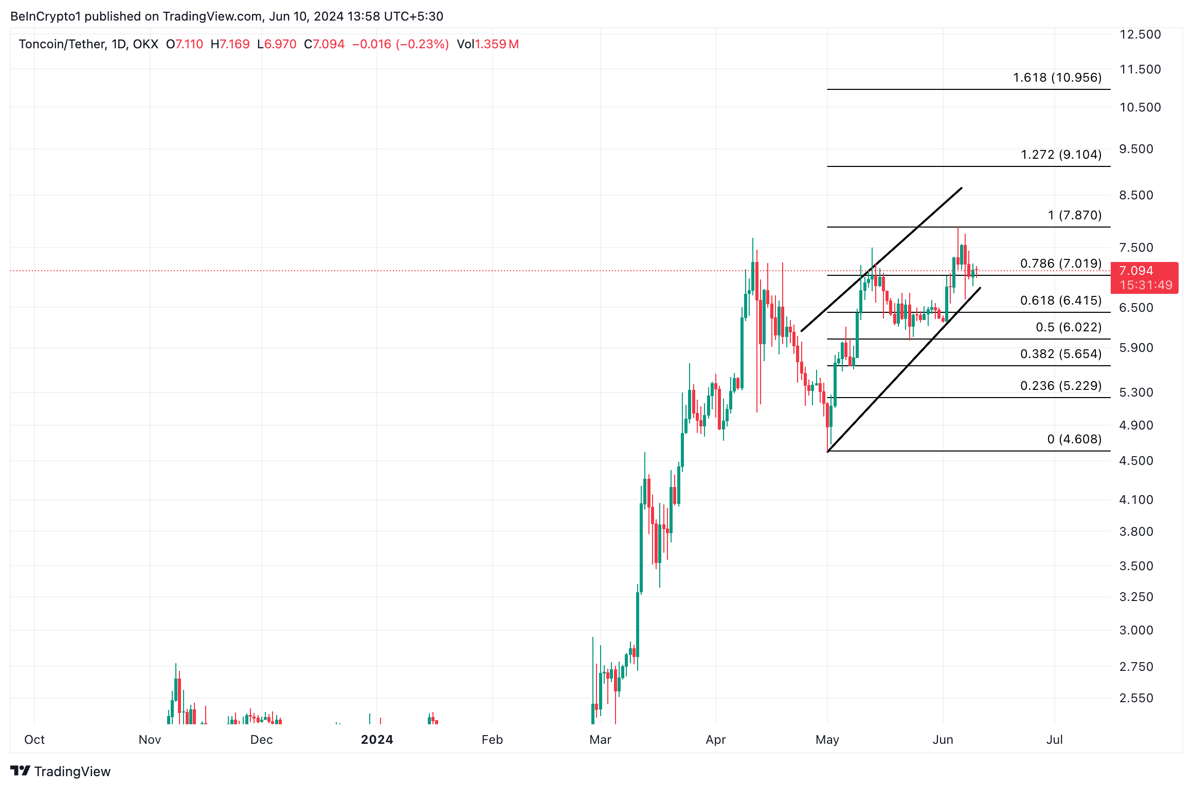 Toncoin se ha enfrentado a una resistencia en 8.64 dólares y ha encontrado un soporte en 6.8 dólares. A 7.03 dólares y en declive en el momento de escribir este artículo, TON parece estar a punto de caer al soporte y por debajo de él.