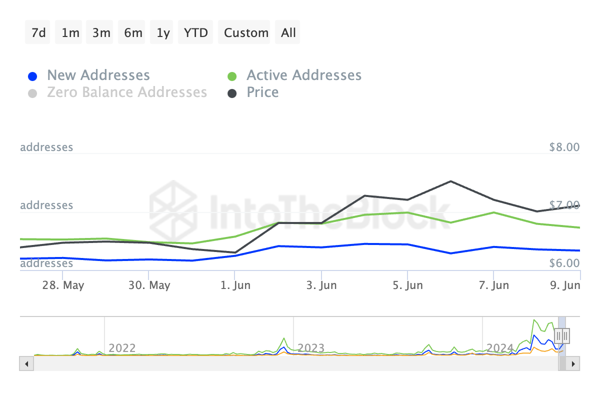 La caída del 7% experimentada por el precio de Toncoin (TON) desde que alcanzó su máximo anual se debe a la disminución del impulso de compra en la última semana. Así lo confirma la caída observada en el recuento de direcciones activas diarias de TON y en el recuento de nuevas direcciones en la última semana.