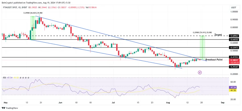 Este patrón alcista sugiere un aumento potencial del 77% para FTM tras la ruptura de la altcoin. Esto sitúa el objetivo de FTM en 0,68 dólares. Si bien es posible que el precio de Fantom no llegue a este punto, podría subir a 0.50 dólares.