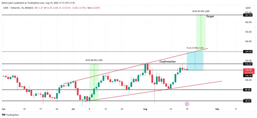 Si bien el precio de AAVE no está al borde de una ruptura, está en camino de notarlo en los próximos días. AAVE, que actualmente se negocia a 110 dólares, está buscando una posible ruptura de la cuña ascendente cada vez más amplia si logra repetir el rally del 20% de la semana anterior.