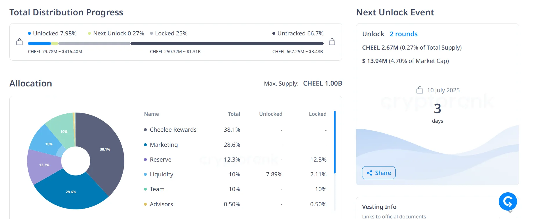 - Número de Tokens a Desbloquear: 2,67 millones de CHEEL (0,27% del Suministro Total)