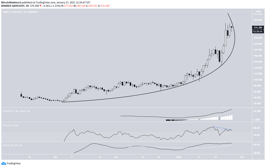 La línea de tendencia se ha vuelto completamente parabólica, y es probable que AAVE se acerque a la cima de la parábola. Mientras que el MACD y el oscilador estocástico son alcistas, se está desarrollando una divergencia bajista en el RSI, que es una señal de debilidad.