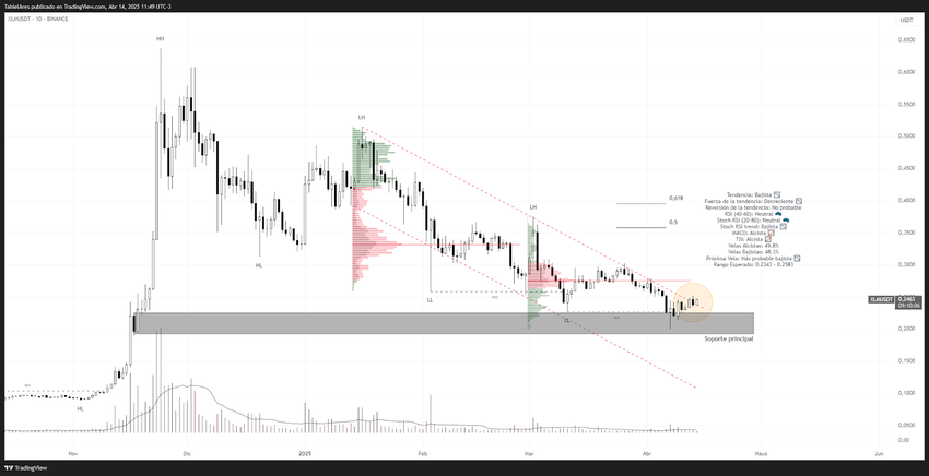 El precio actualmente opera dentro de un canal descendente, y ha mostrado un rebote desde la parte baja del canal, cotizando alrededor de los 0.108 dólares. Este rebote ocurre tras una fuerte caída, y se observa una leve recuperación de volumen de compra, aunque todavía sin señales contundentes de reversión.