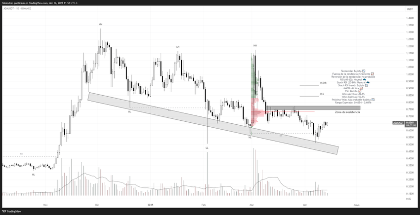 El precio ha rebotado recientemente desde una zona de soporte importante ubicada en torno a los 0.57 dólares y 0.58 dólares, saliendo momentáneamente del canal bajista que lo contenía desde principios de año.