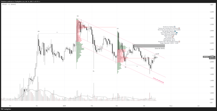XRP ha venido operando dentro de un canal bajista bien definido desde sus máximos históricos más recientes, marcando una secuencia clara de máximos y mínimos descendentes.