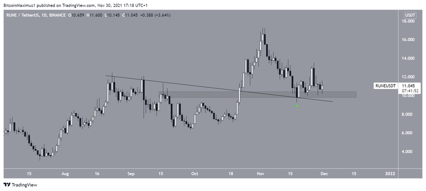RUNE ha salido de una línea de resistencia descendente. Volvió a validarlo como soporte el 18 de noviembre (icono verde) antes de rebotar y moverse hacia arriba. El rebote también sirvió para validar el área horizontal de 10 dólares como soporte.