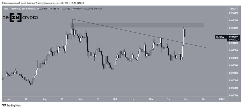 RSR ha salido de una línea de resistencia descendente y se está acercando a los máximos de septiembre en 0.06 dólares. Una vez que logre moverse por encima de esta área de resistencia horizontal, no quedaría más resistencia hasta el precio máximo histórico de 0.1 dólares.