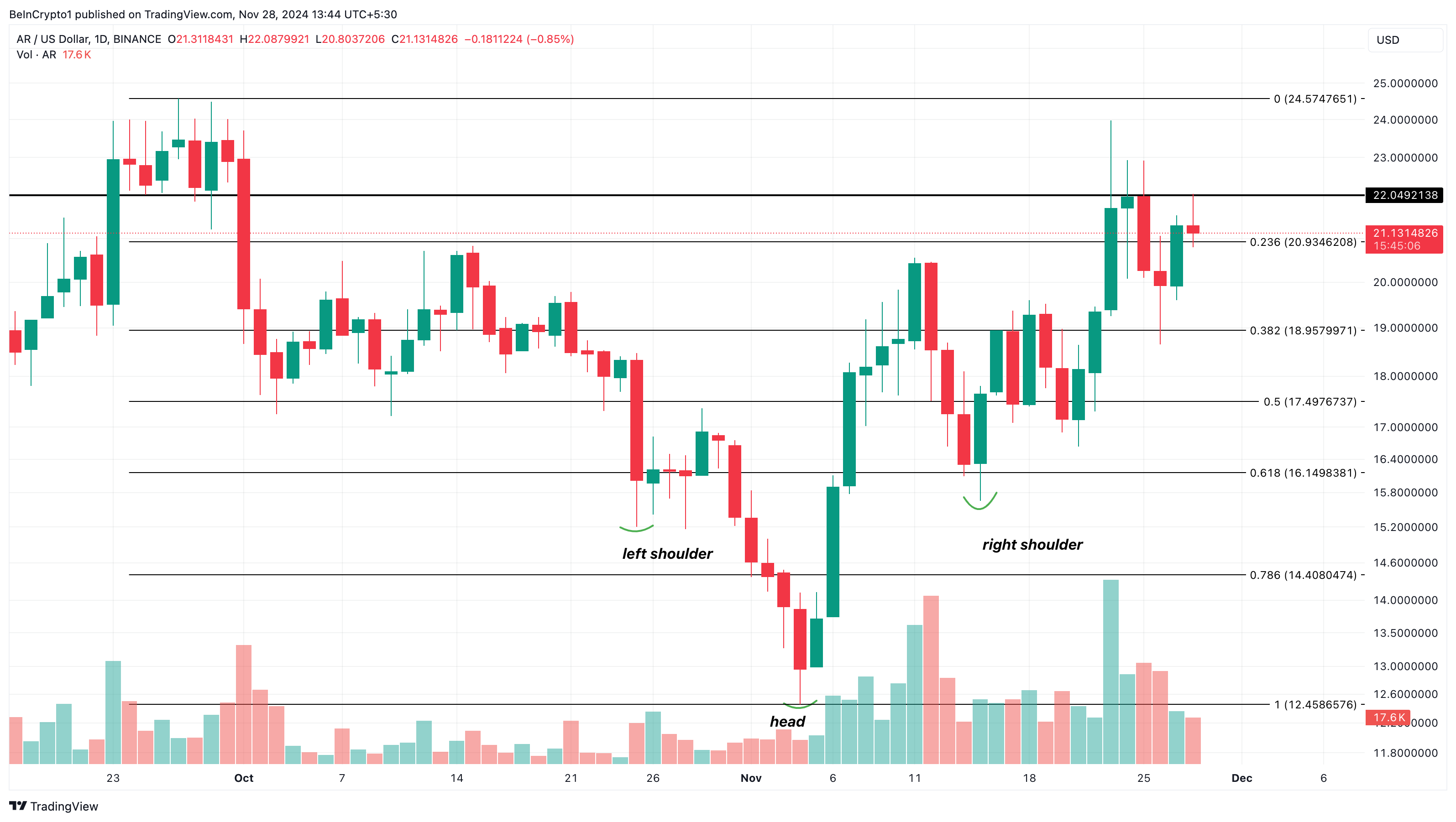Al momento de la publicación, el precio del token es 21.13 dólares. El gráfico diario muestra que la altcoin alcanzó este precio debido a la formación de un patrón de cabeza y hombros invertido.