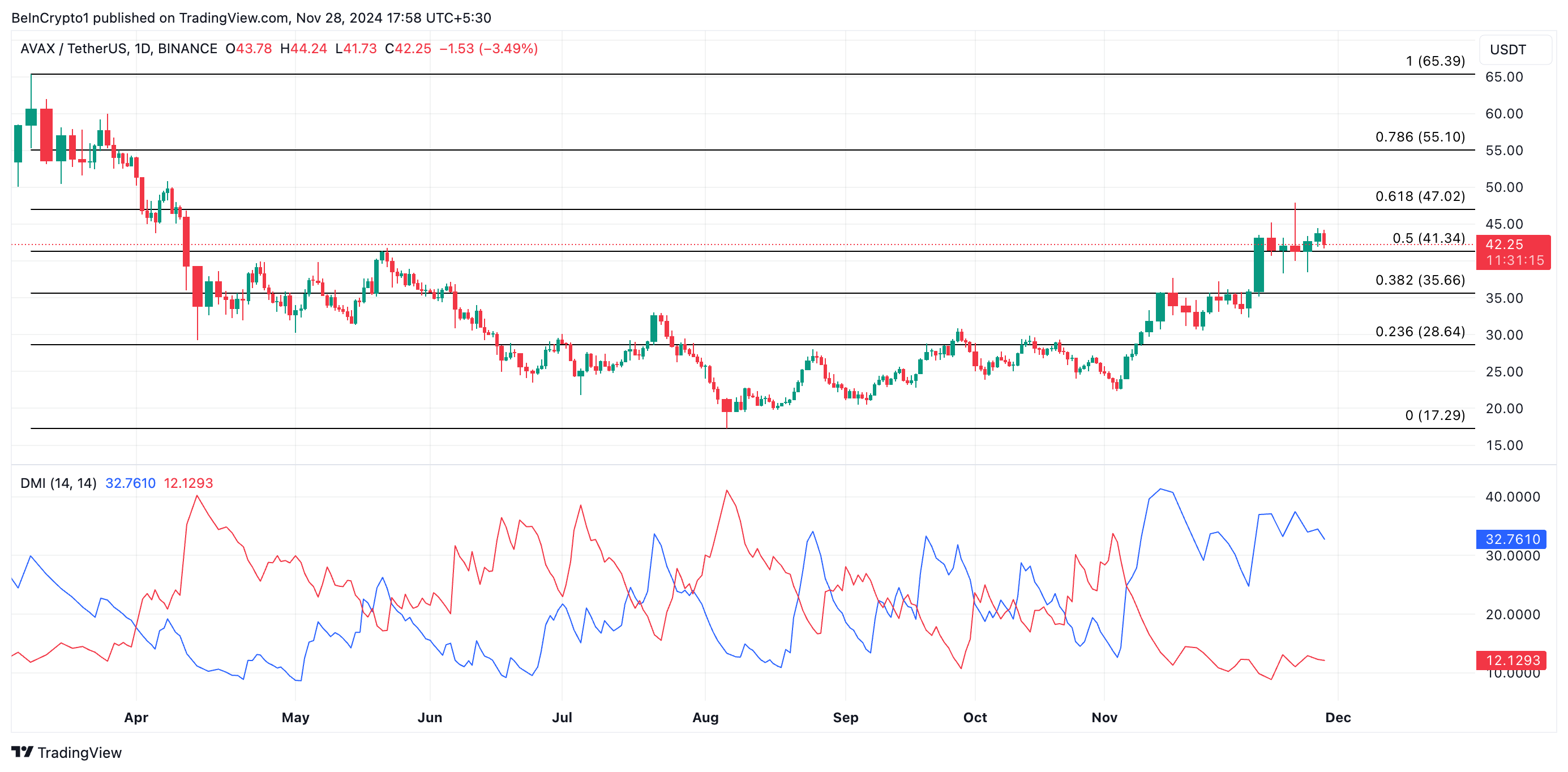 AVAX, el token nativo de la blockchain de Capa 1 Avalanche, ha experimentado un crecimiento del 20% en su precio en la última semana, convirtiéndola en una de los altcoins basados en RWA clave a observar en diciembre. Al momento de escribir esto, la altcoin se negocia a 42.25 dólares.