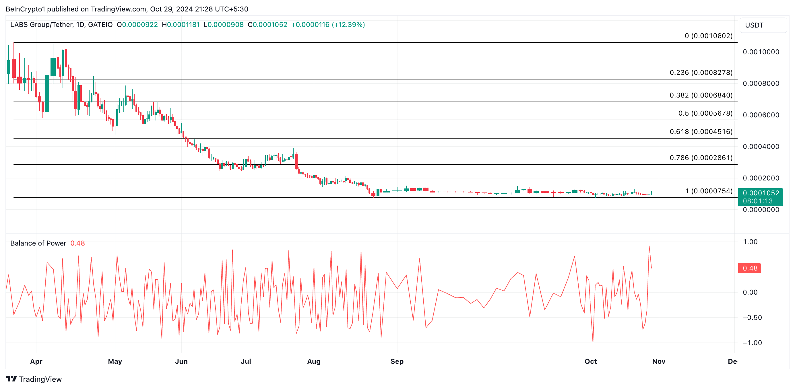 Si el impulso de compra se mantiene, LABS podría subir a 0.00028 dólares, un nivel visto por última vez en julio. Sin embargo, una reducción en la acumulación de tokens podría llevar el precio hacia abajo hacia el nivel de soporte de 0.000075 dólares.