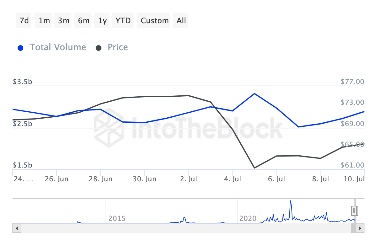 Las ballenas de criptomonedas procesaron aproximadamente 3,32 mil millones de dólares en Litecoin (LTC), según IntoTheBlock. Esta significativa actividad de las ballenas es una de las razones por las cuales el precio de LTC aumentó un 19.86% en los últimos siete días.