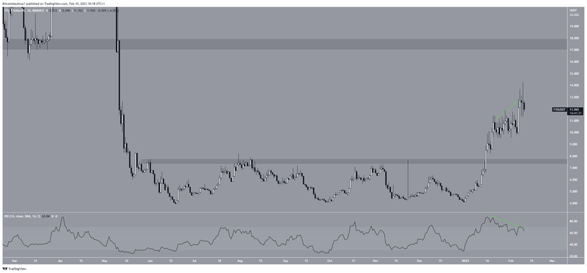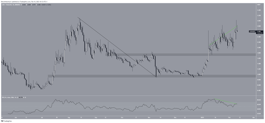 El precio de LDO ha aumentado rápidamente desde principios de año. Sin embargo, desde el 8 de enero creó tres mechas superiores largas, que se consideran signos de debilidad. También se combinaron con divergencia bajista en el RSI.