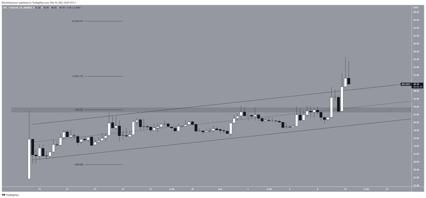 El precio de RPL rompió un canal paralelo ascendente el 8 de febrero. Si bien alcanzó un máximo de 56.60 dólares al día siguiente, creó una mecha superior larga y comenzó a caer. El rechazo validó el nivel de Fibonacci externo de 1,61 como resistencia.