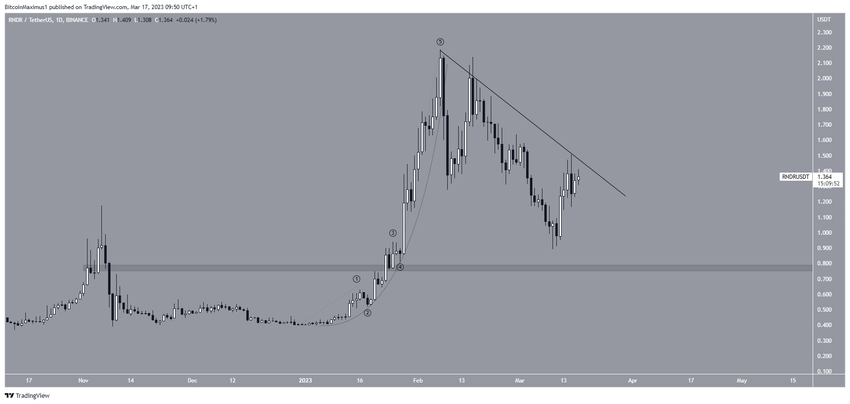 El precio de RNDR ha caído desde que rompió una parábola el 8 de febrero. La caída llevó a un mínimo de 0.89 dólares el 19 de marzo.