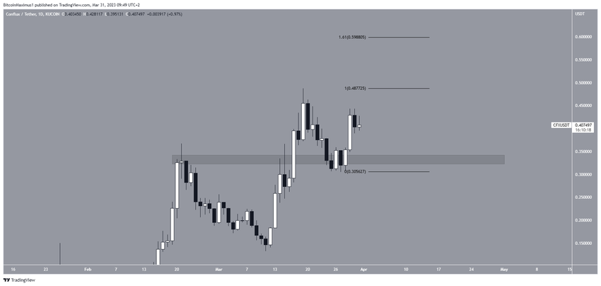 SponsoredSi el aumento continúa, CFX podría aumentar a un máximo de 0.600 dólares, creado por el retroceso externo de Fibonacci de 1.61 de la caída reciente.